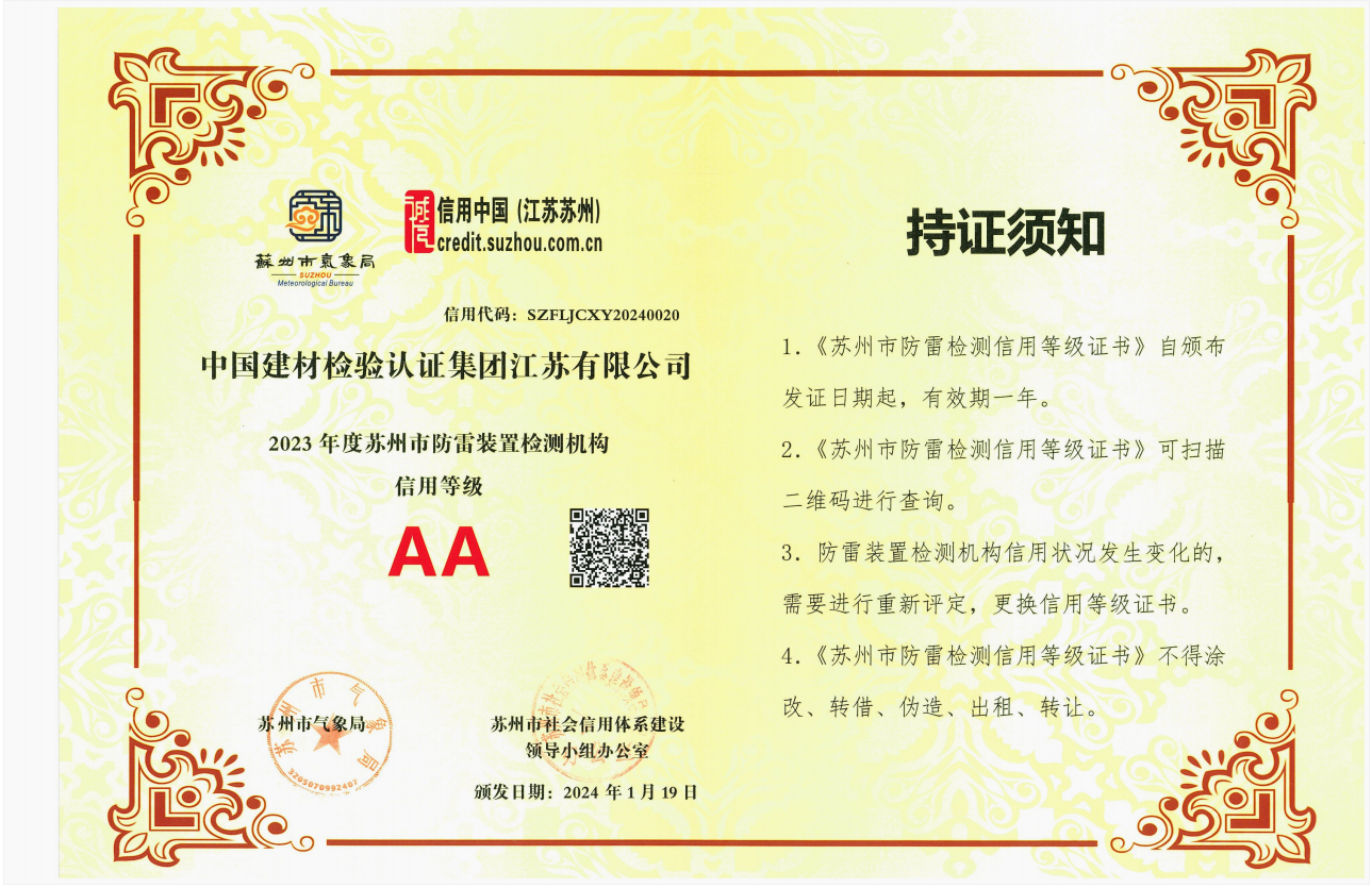 • 2023年度蘇州市防雷裝置檢測(cè)機(jī)構(gòu)信用等級(jí)AA