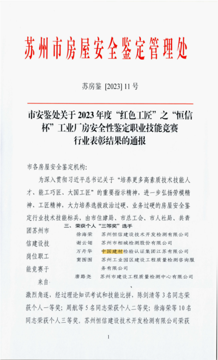 • 2023年度蘇州市住建系統(tǒng)一線(xiàn)崗位職工“紅色工匠”之“恒信杯”工業(yè)廠(chǎng)房安全性鑒定職業(yè)技能競(jìng)賽競(jìng)賽表彰