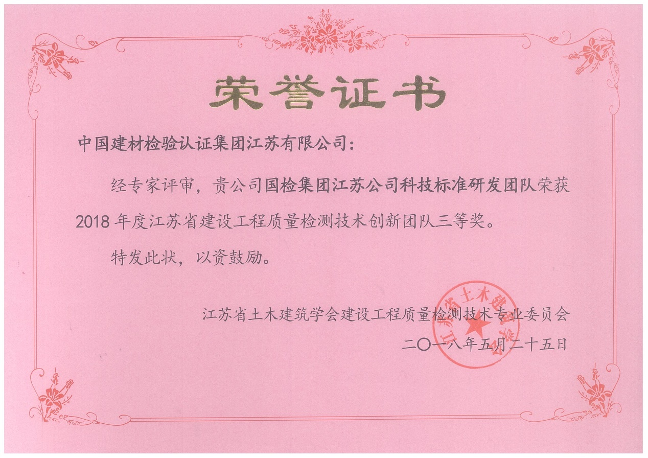 • 2018年度江蘇省建設(shè)工程質(zhì)量檢測(cè)技術(shù)創(chuàng)新團(tuán)隊(duì)三等獎(jiǎng)