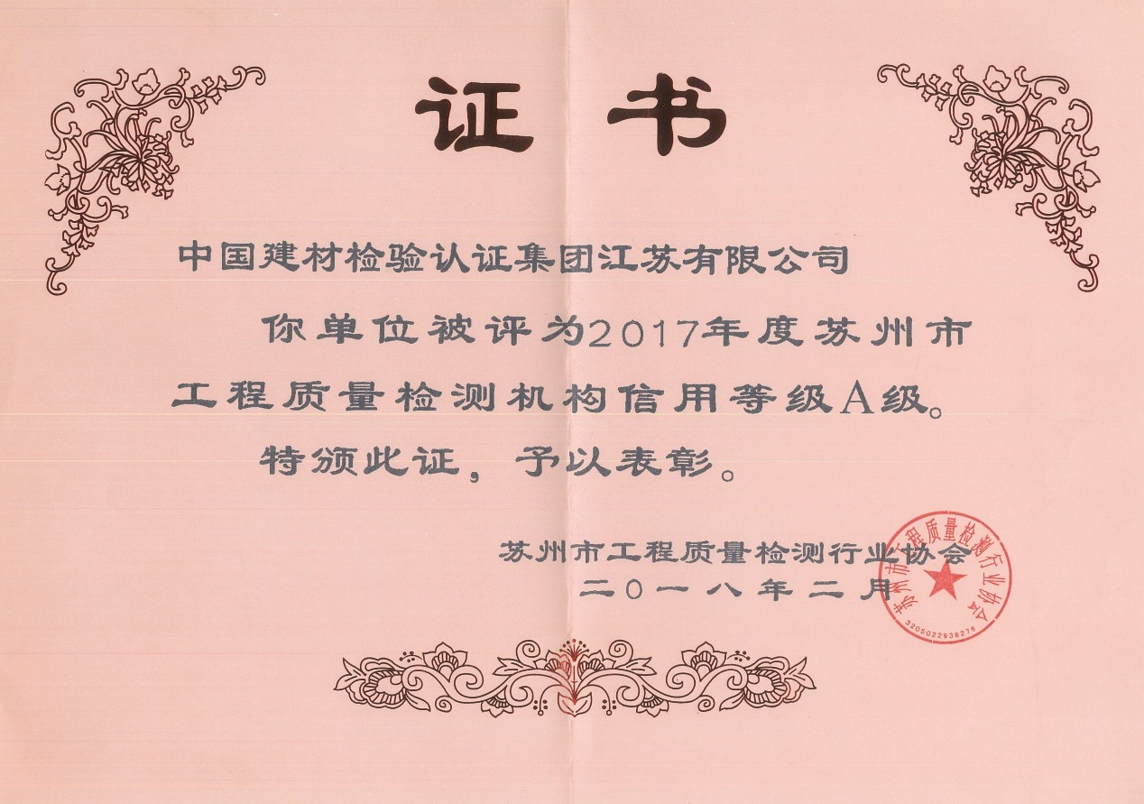 • 2017年度蘇州市工程質(zhì)量檢測(cè)機(jī)構(gòu)信用等級(jí)A級(jí)
