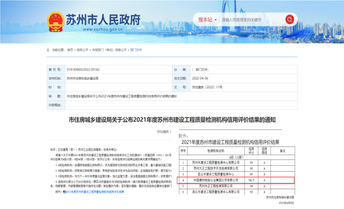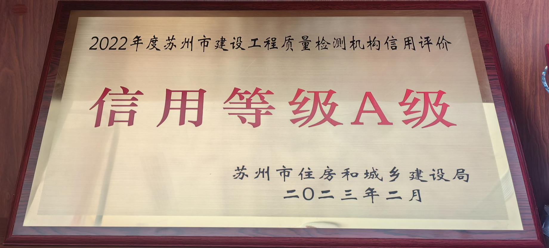 • 2022年度蘇州市建設(shè)工程質(zhì)量檢測(cè)機(jī)構(gòu)信用評(píng)價(jià)A級(jí)