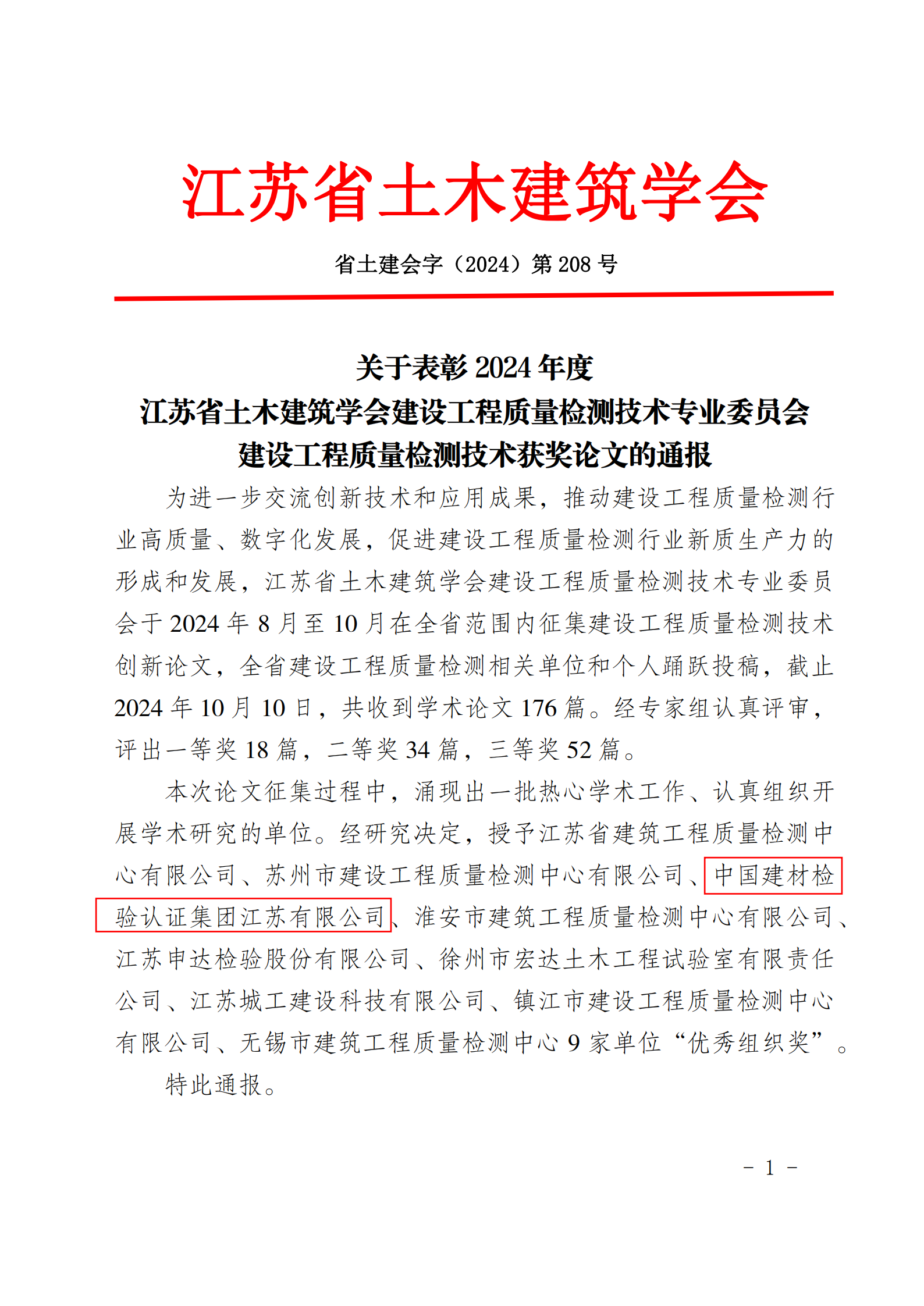 • 2024年度江蘇省土木建筑學(xué)會(huì)建設(shè)工程質(zhì)量檢測(cè)技術(shù)專(zhuān)業(yè)委員會(huì)論文“優(yōu)秀組織”獎(jiǎng)